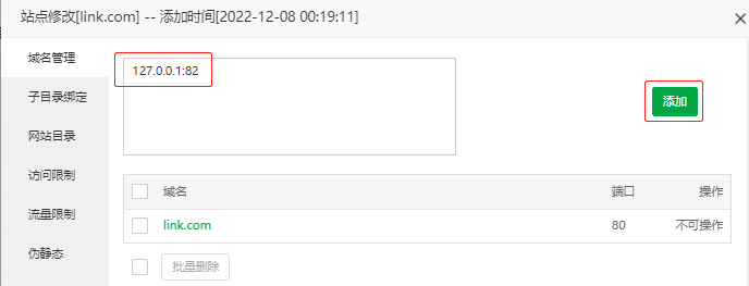 再编辑网站 link.com,添加域名 127.0.0.1:82。